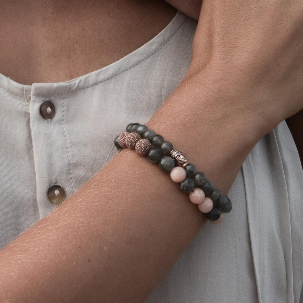 Eine klassische Kombination aus Rosé und Grau interpretiert mit Labradorit in 6 mm verleiht diesem Damenarmband einen betont femininen Touch. Der in Roségold vergoldete Buddha ergänzt die schlichte Farbgebung harmonisch und erzeugt einen edlen Blickfang im zurückhaltenden Auftreten dieses Buddha Armbands.