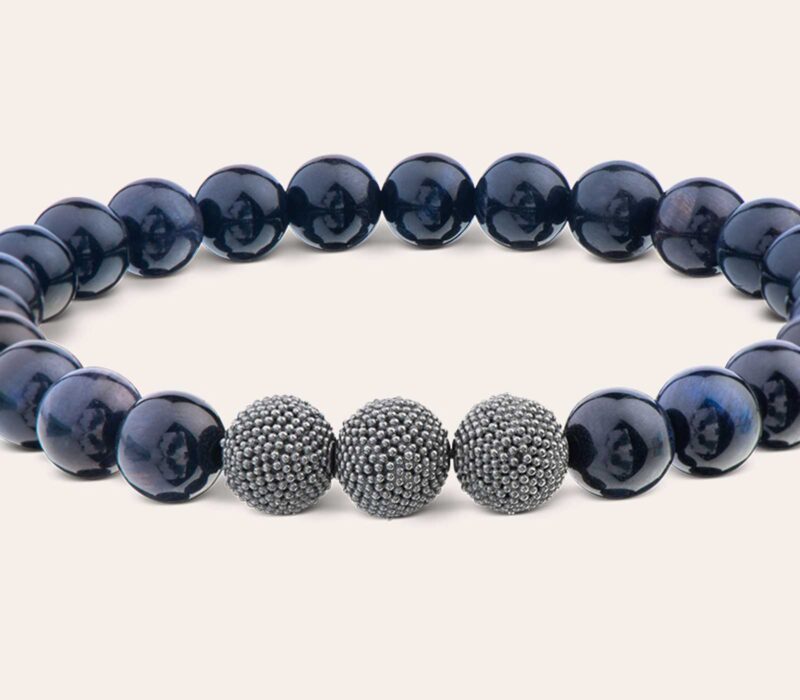 Unser elegantes Herrenarmband aus nachtblauem Tigerauge (8 mm) besticht durch die ruhige Harmonie im Zusammenspiel mit den geschwärzten Silberperlen - Dein dezenter Eyecatcher für den stilvollen Alltag.