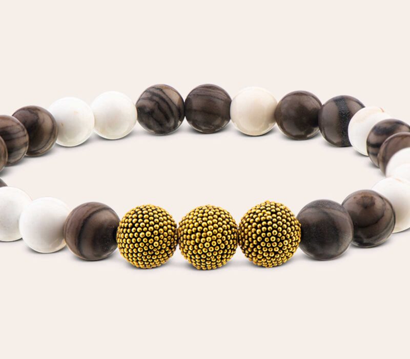 Verleihe Deinem Handgelenk das gewisse Etwas mit unserem sommerlichen Herrenarmband aus cremefarbenem Magnesit & schokobraunem Kaffee Jaspis in 8 mm, kombiniert mit matt vergoldeten Silberperlen für Deinen legeren Look.