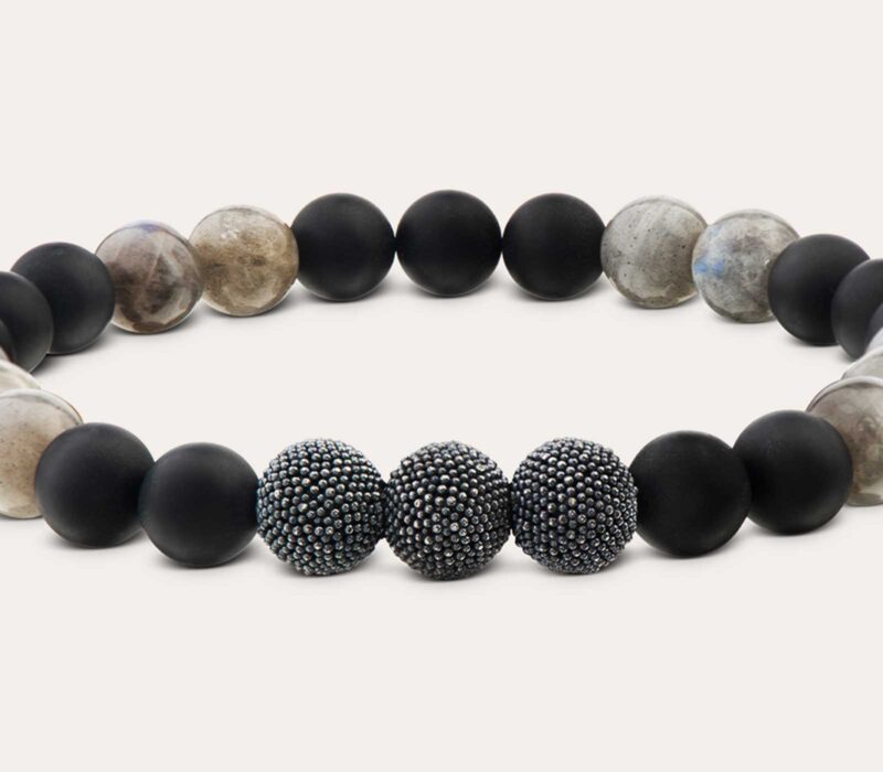 Charaktervolles Herrenarmband in minimalistischen Design aus Labradorit & mattem Onyx (8 mm). Die extra geschwärzten Silberperlen ergänzen die Wirkung des Armbands eindrucksvoll für einen tollen Akzent an Deinem Handgelenk.