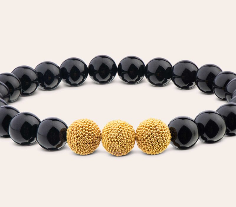 Einen markant-edlen Akzent schafft dieses Herrenarmband in schlichtem Design aus tiefschwarz glänzendem Onyx (8 mm) harmonisch ergänzt mit vergoldeten Jawan Beads, für einen stilvollen Eyecatcher am Handgelenk.