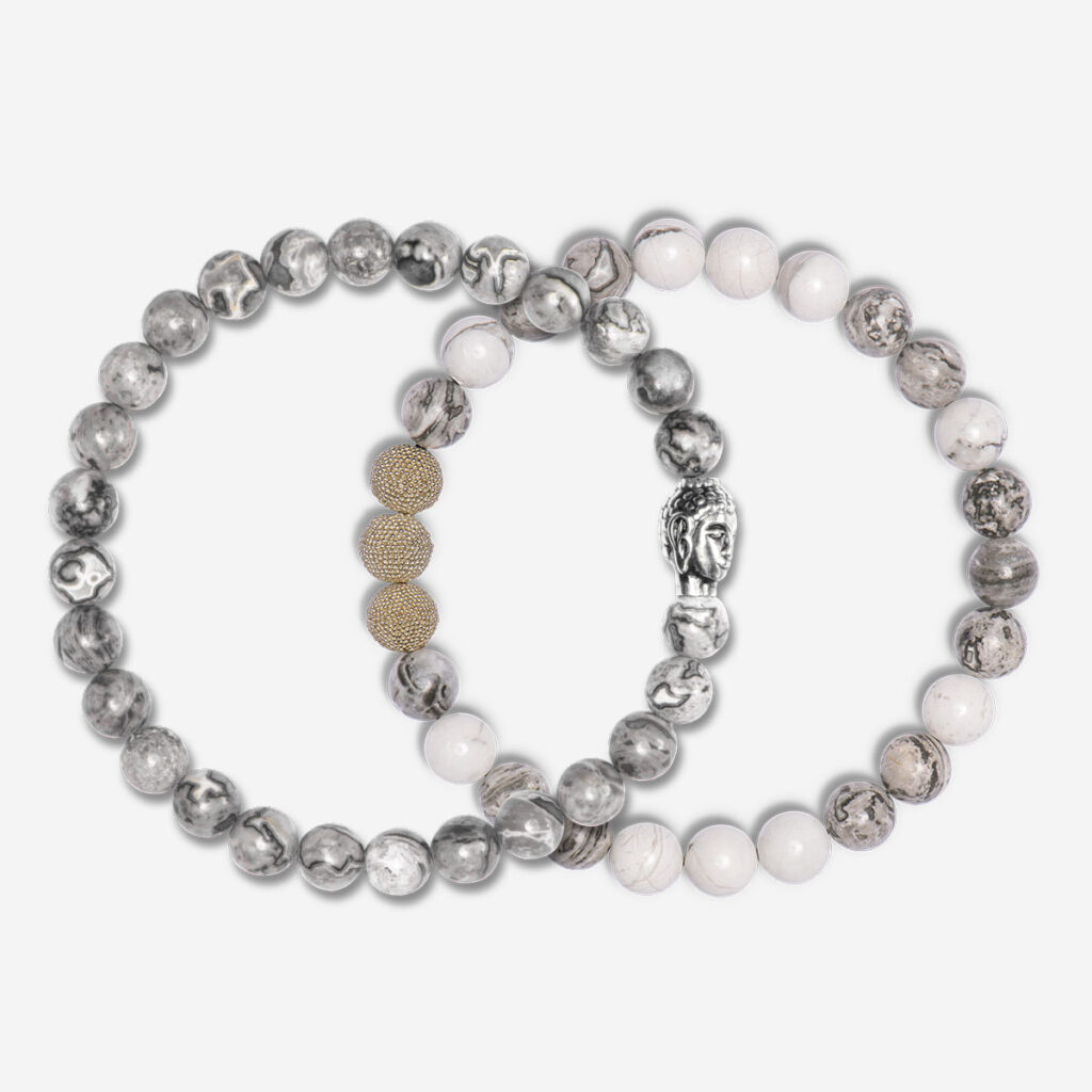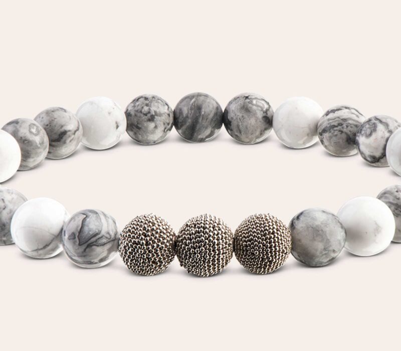 Der klassische Farbmix Weiß & Grau, aus Howlith und Picasso Jaspis in 8 mm, verleiht mit den handgefertigten Jawan Beads eine zeitlos-elegante Ausstrahlung.