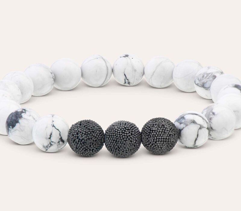 Schlichte Eleganz für stilvolles Understatement bietet dieses Herrenarmband mit kräftigen 10 mm Howlith Beads und den in exklusivem Black Rhodium veredelten Silberperlen – einfach & unkompliziert schön für Deinen stylischen Sommer-Look.
