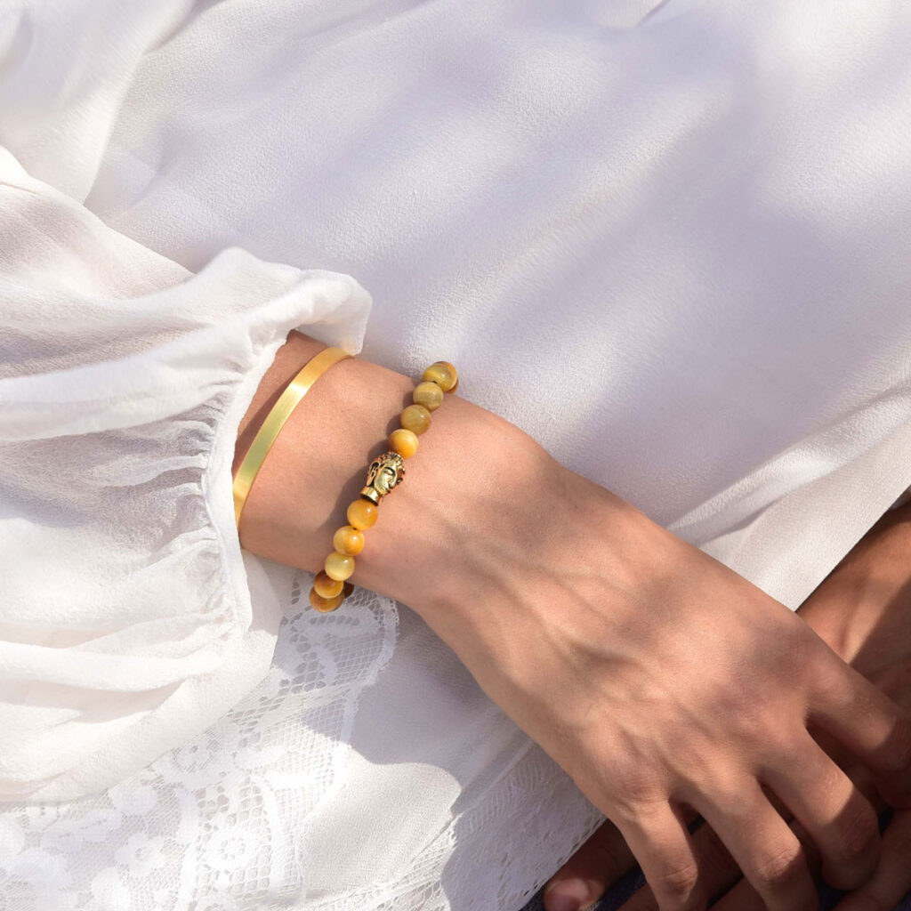 Dieses Damenarmband aus 8 mm Perlen mit vergoldetem Buddha leuchtet an Deinem Handgelenk und gibt Deinem Outfit das besondere Etwas, egal ob elegant, casual oder im Business. Gelbes Tigerauge leuchtet in den verschiedensten Gelb- und Ockertönen, wird teilweise mit karamelbraunen Schlieren durchzogen und besticht durch seinen seidig schimmerndem Glanz. Das gold-schimmernde Tigerauge wirkt gegen Stress und Stimmungsschwankungen, lässt Zweifel schwinden und hilft als Erdungsstein bei Unklarheiten oder Zweifeln den richtigen Weg zu erkennen.