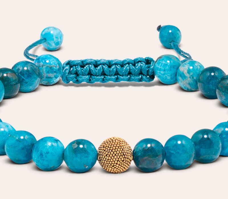 Mach Dich bereit, in den Glanz und die Schönheit dieses Apatit Perlenarmbands einzutauchen. Apatit besticht durch seine atemberaubenden Farbnuancen aus unterschiedlichen Blautönen und Grünschattierungen, die dem Armband eine unglaubliche Ausstrahlung verleihen. Das blau-grüne Mineral mobilisiert Energiereserven und stärkt die Eigenständigkeit, um so Lustlosigkeit und Routine hinter sich zu lassen. Die natürliche Schönheit und Leuchtkraft des Apatit verleiht dem Armband eine unverwechselbare Note. Lass dich von der magischen Anziehungskraft des Apatit und der zeitlosen Eleganz der vergoldeten Silberperle verzaubern & fühl Dich jeden Tag aufs Neue selbstbewusst und strahlend schön.
