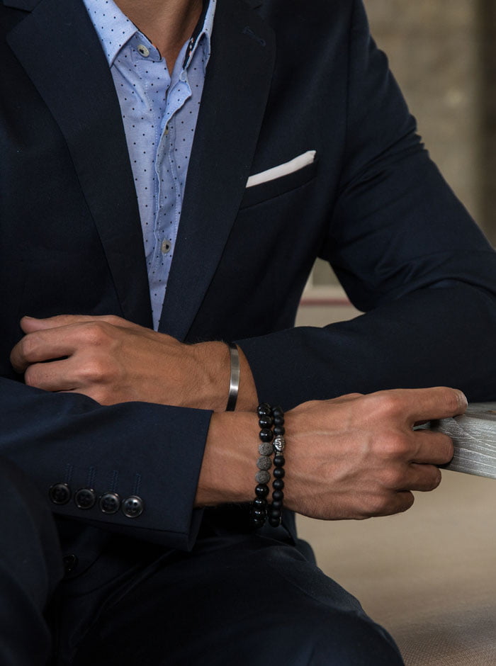 Im Business sollte Mann sich vor dem Anlegen eines Armbands durchaus ein paar Gedanken machen. So passt zum Anzug mit Krawatte ein eher schlichtes Armband mit 6 oder 8 mm Perlen, auch abhängig von der Stärke des Handgelenks. Hingegen würden 10 mm Perlen hier wohl eher deplatziert wirken.